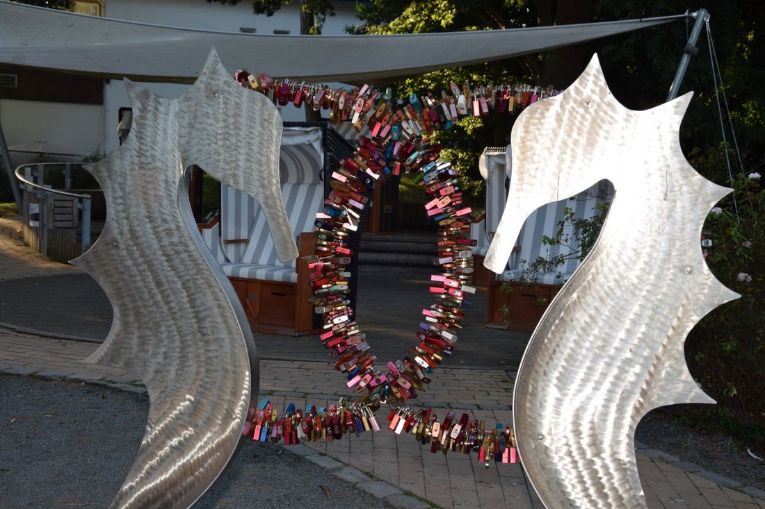 Als Zeichen der ewigen Zusammengehörigkeit können Brautpaare an einer Seepferdchenskulptur, dem Wappentier der Gemeinde, ein Liebesschloss anbringen.