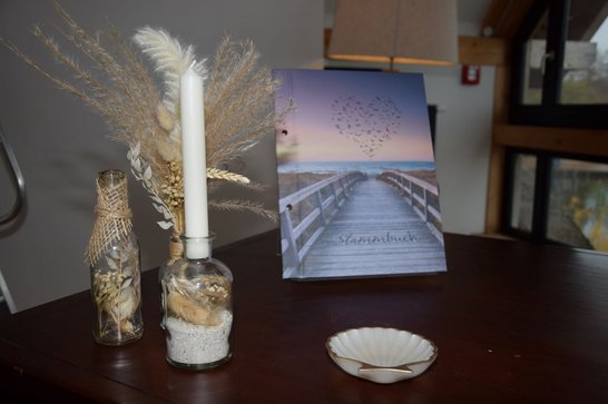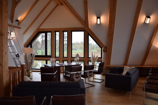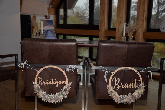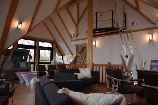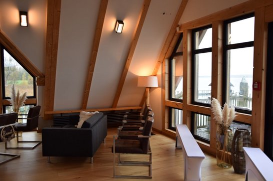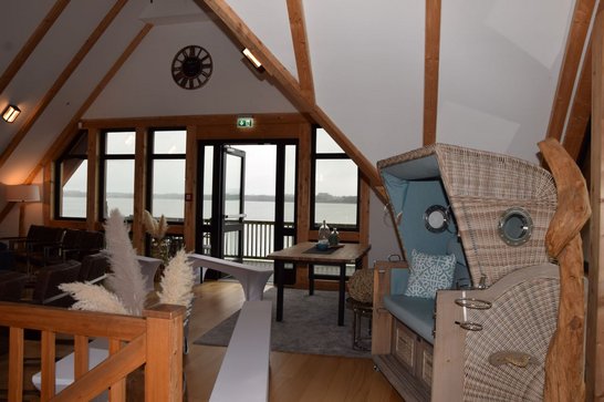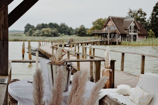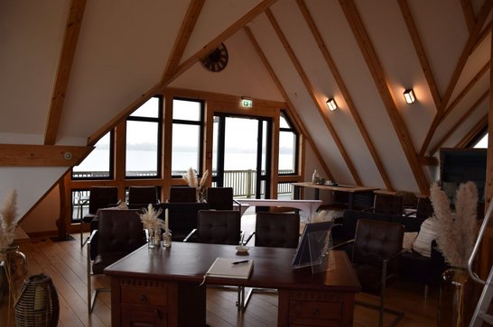 Sollte Petrus seine Himmelsschleusen öffnen und den Bund fürs Leben mit Regen segnen, steht ein stilvoller Ausweichraum im ersten Stock des ebenfalls mit Reet gedeckten Fachwerkhauses zur Verfügung. Hier finden bis zu 30 Personen Platz. Der Raum kann auch regulär für Trauungen gebucht werden. Dachschrägen, sichtbare Holzbalken und Holzdielen sorgen für urige Gemütlichkeit. Das Gebäude wurde in Pfahlbauweise im See errichtet. Der Blick über den Hemmelsdorfer See, der sich dem Brautpaar und den Hochzeitsgästen bietet, ist phantastisch.